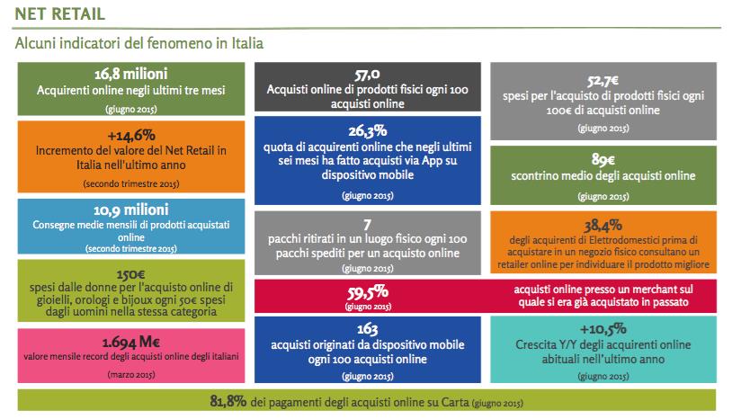 Secondo il consorzio NetComm si afferma sempre di più il Net Retail, una “modalità di acquisto di prodotti e servizi abilitata dall’interconnessione sulla rete Internet di diversi soggetti che si occupano ciascuno di una parte dell’intero processo di vendita. Il Net Retail, nel suo insieme, consente alle persone di individuare, scegliere, ordinare, pagare ed entrare in possesso dei prodotti acquistati a distanza usando solo tecnologie digitali”.