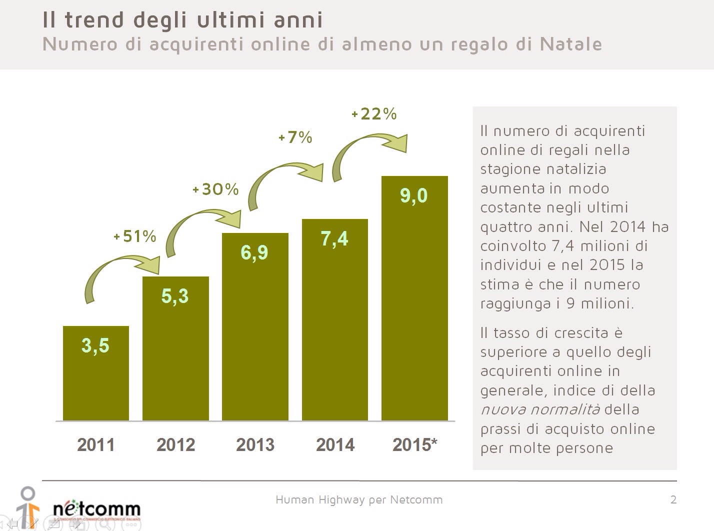 “Abbiamo stimato in 3,1 miliardi di euro il totale di acquisti online che saranno effettuati nei 45 giorni che precedono il Natale e ben 1,8 miliardi sono attribuibili ad acquisti di prodotti fisici” dichiara Roberto Liscia, Presidente di Netcomm, Consorzio del Commercio elettronico italiano. “Negli ultimi quattro anni questa tendenza ha visto una crescita continua e costante: nel 2011 gli italiani che affermavano che avrebbero comprato almeno un regalo di Natale online erano 3,5 milioni; nel 2015 sono 9 milioni”.