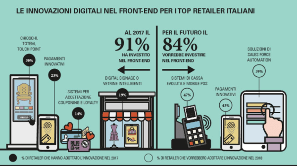 Se prendiamo ad esempio gli (esigui ahimè) investimenti in innovazione digitale nel retail in Italia la percentuale di chi ha sviluppato almeno una innovazione digitale nel front-end a supporto della customer experience in punto vendita è elevata e copre quasi tutto il campione (91%). Si tratta però spesso di soluzioni scenografiche che offrono solo un beneficio limitato al cliente nel soddisfare le proprie necessità.