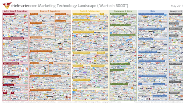 Partiamo da un esempio difficile, per rendere subito l’idea: volete scegliere una soluzione per migliorare le “vostre attività di contatto con il cliente”. Non c’è il problema della scarsità di scelta, dato che secondo la “marketing technology landscape supergraphic” di Scott Brinker per il 2017 sono stati mappati 5,381 soluzioni di 4,891 diverse aziende!