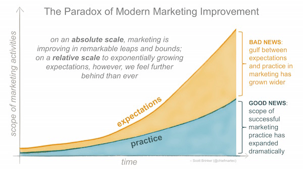Infine, Scott Brinker parla di paradosso nell’evoluzione del marketing moderno, in cui i marketer moderni tendono a sentirsi sempre “indietro” rispetto a dove vorrebbero essere, anche quando stanno compiendo notevoli progressi se misurati in modo analitico e non di sola percezione.