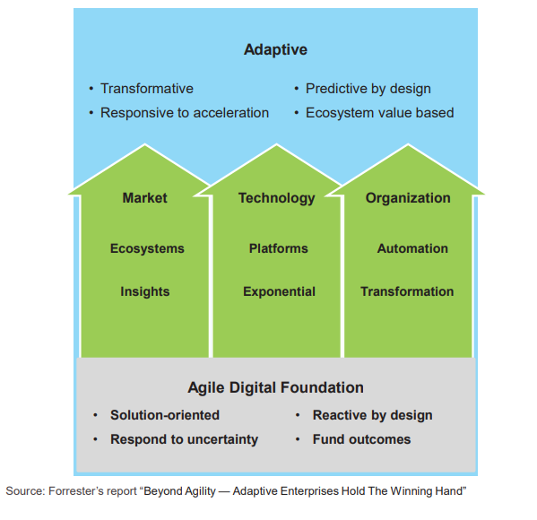 Nel 2019 ho partecipato, ancora in presenza a Londra, al forum Forrester sulla Trasformazione Digitale e l’innovazione in cui si era parlato del concetto di “adaptive enterprise”, ossia quelle organizzazioni che si caratterizzano nel “anticipate tomorrow’s markets and customer needs, leveraging tech-driven innovation and arming the organization for constant change“, portando a casa dei risultati decisamente sopra la media di mercato.