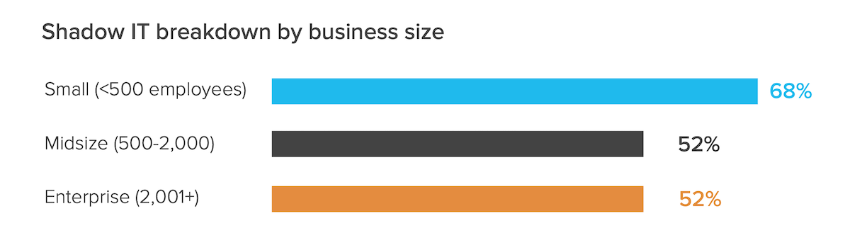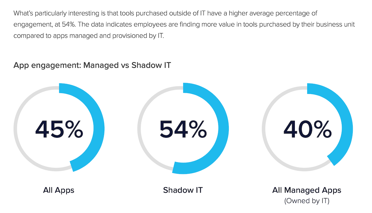 Ancora, le cosiddette app shadow IT hanno un coinvolgimento significativamente maggiore (54%) rispetto alle app gestite/di proprietà dell’IT (40%). (Productiv ha definito il “coinvolgimento dell’app” come l’utilizzo a livello di funzionalità all’interno degli strumenti su base mensile, in tutti gli strumenti, per ogni dipendente con una licenza).
