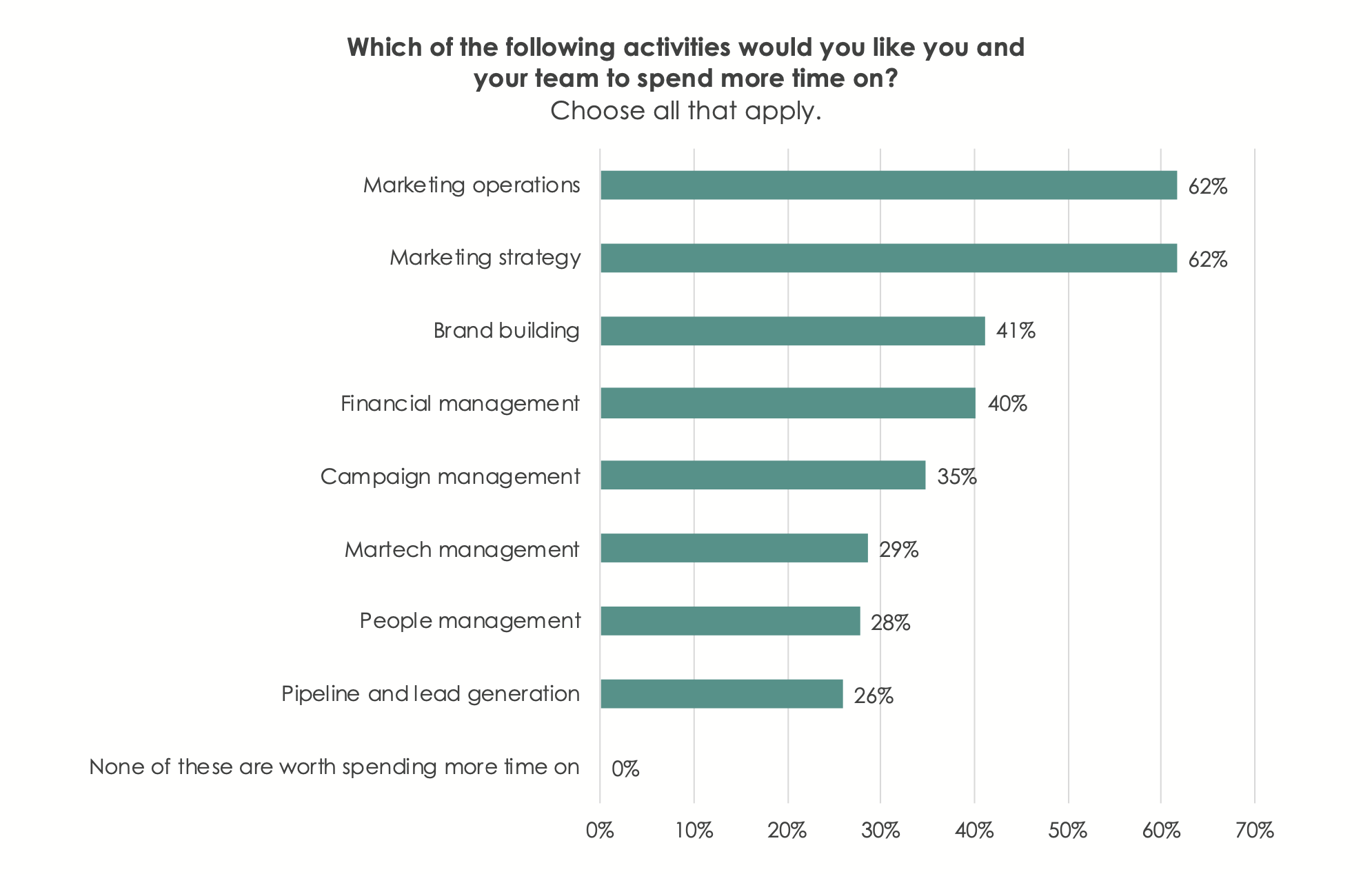 Se al primo posto ci sono Strategia e Planning, ai numeri #2 e #3 troviamo rispettivamente “Processi di marketing e modi di lavorare” (44%) e “Acquisizione e utilizzo della tecnologia” (38%). In altre parole, marketing operations e martech.