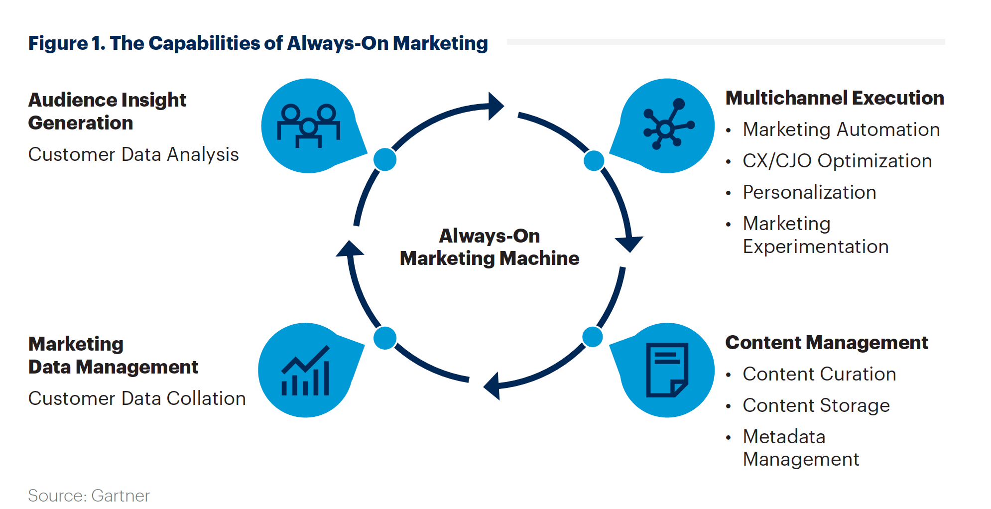 Sempre attingendo da Gartner, la macchina del marketing è a tutti effetti ormai “always on”, come si vede bene nella figura sotto.