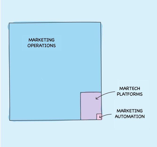 Ancora, Darrel Alfonso, a capo delle Marketing Operations di AWS, scrive su LinkedIn che “Marketing ops encompasses the people, planning, technology, processes, and data that enables great marketing” e ne fa un insieme più grande di cui la Martech fa parte (figura sotto).