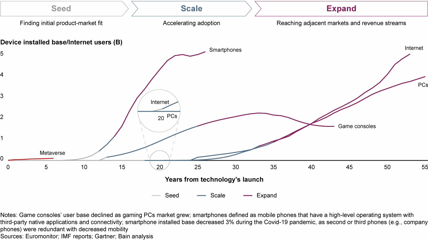 Secondo gli analisti di BAIN, il metaverso probabilmente rimarrà nella prima fase di sviluppo, quella che chiamano la fase “seme” del percorso di sviluppo della piattaforma, per almeno altri 5-10 anni (vedi immagine sotto).